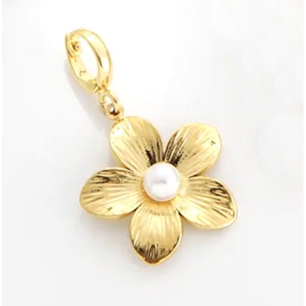 This 18K plated copper Flower and Pearl Charm features a convenient clasp that easily opens, allowing you to add it to any necklace or bracelet and you can switch it out whenever you like. It’s perfect for adding a fun, beachy touch to your everyday style.