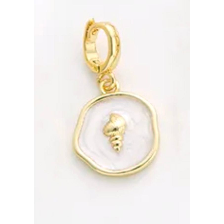 Add a splash of seaside charm to your look with this white and gold Shell Charm. Crafted from 18K plated copper and enamel, it features an easy-to-use clasp that lets you attach it effortlessly to any necklace or bracelet. Perfect for switching up your style, this charm brings a playful, beachy vibe to your everyday outfits.