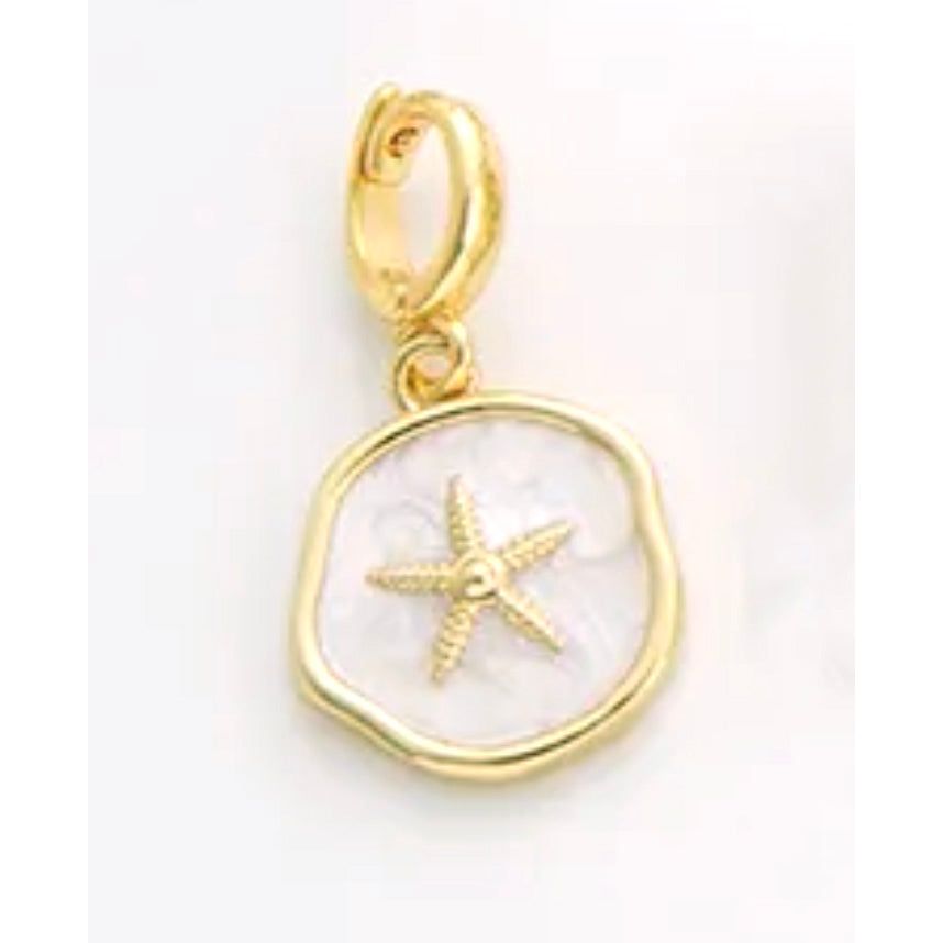 Add a splash of seaside charm to your look with this white and gold Starfish Charm. Crafted from 18K plated copper and enamel, it features an easy-to-use clasp that lets you attach it effortlessly to any necklace or bracelet. Perfect for switching up your style, this charm brings a playful, beachy vibe to your everyday outfits.