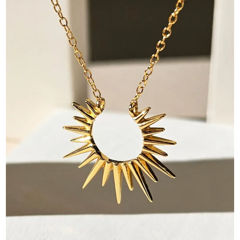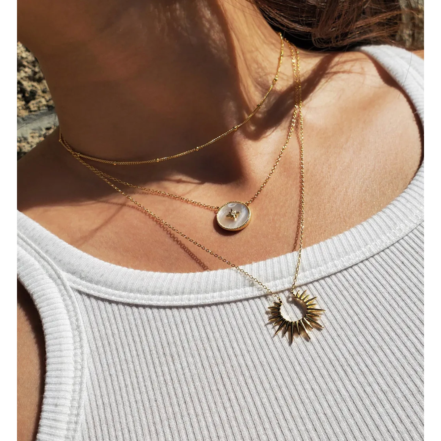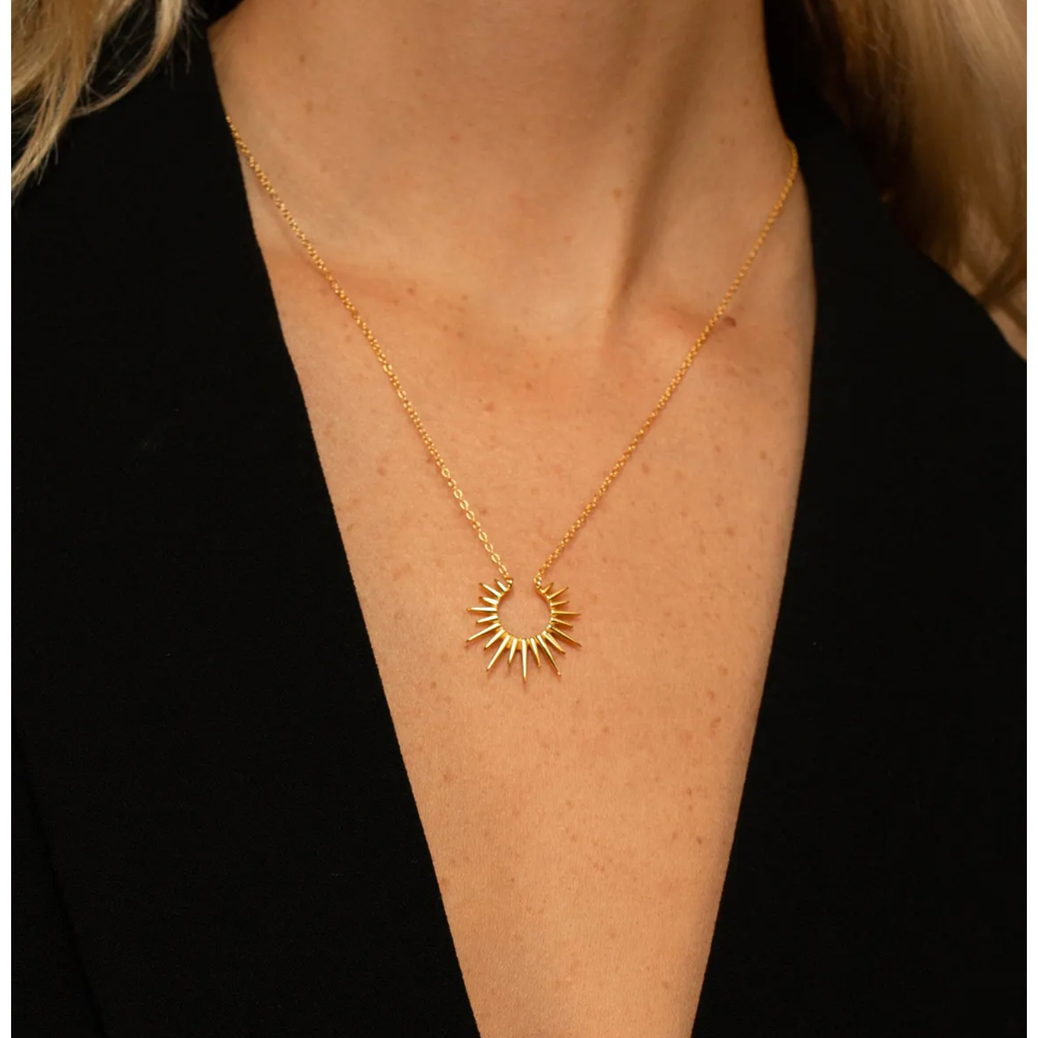 Catch all the golden hour vibes! This gorgeous Clara Sun Burst Necklace offers effortless beachy fun with its striking design. Made from resilient 18K stainless steel and featuring an 18-inch chain plus a 2-inch extender, it's comfortable, stylish, and perfect for adding a luminous touch to your look as you explore the charming coast.