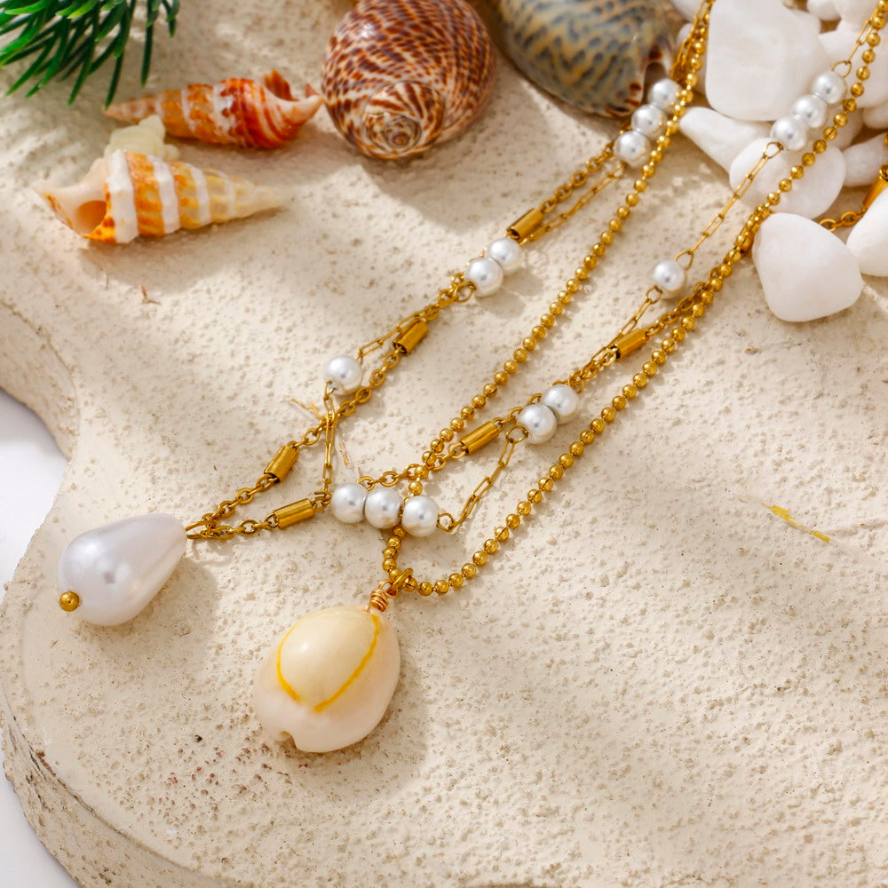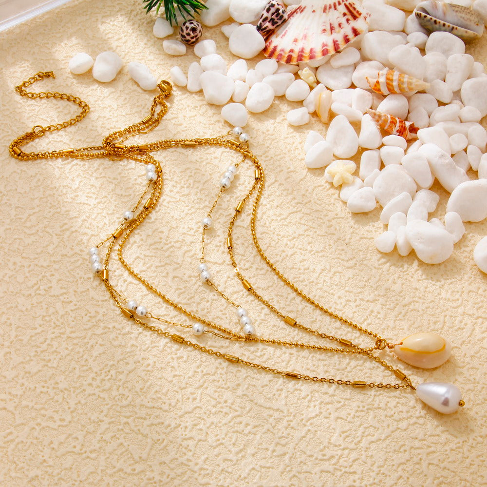 Say hello to your new summer obsession — the Marlee Necklace! This dreamy 3-layer piece features dainty pearls, coastal-inspired gold chains, and two statement charms: a creamy natural shell and a luminous pearl drop.